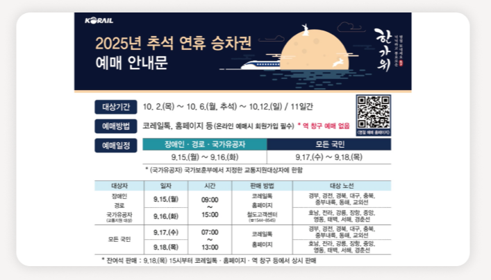 예매 일정은 9월 15일~18일이며, 코레일과 SR 각각 시스템이 다르므로 반드시 일정과 방식에 익숙해져야 합니다.